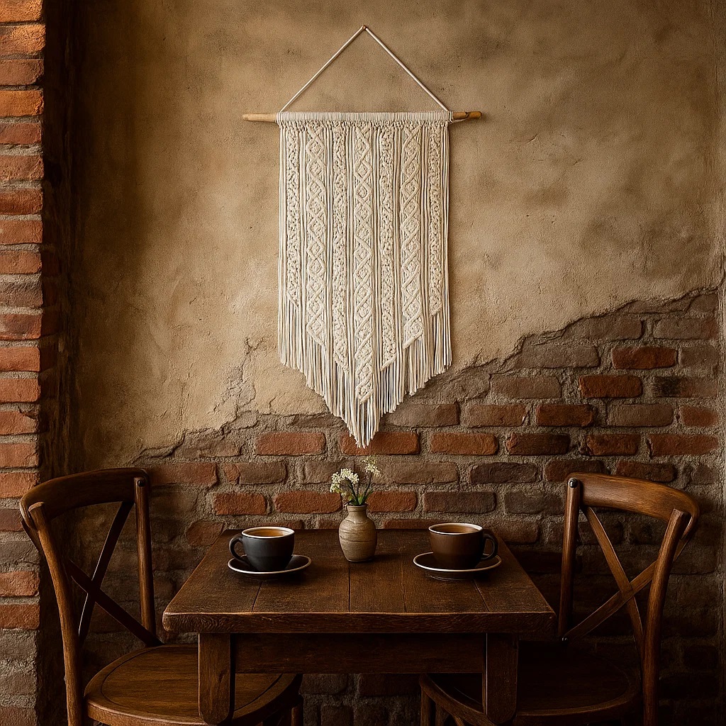ترکیب نخ سفید با چوب طبیعی، حس آرامش و هماهنگی با طبیعت را تداعی میکند و باعث میشود دکور منزل شما روحی تازه بگیرد. طراحی این مکرومه، با الهام از سبک بوهو و طبیعت، جلوهای خاص به دیوار اتاق نشیمن، پذیرایی یا اتاق خواب میدهد و محیطی دلانگیز و صمیمی خلق میکند.