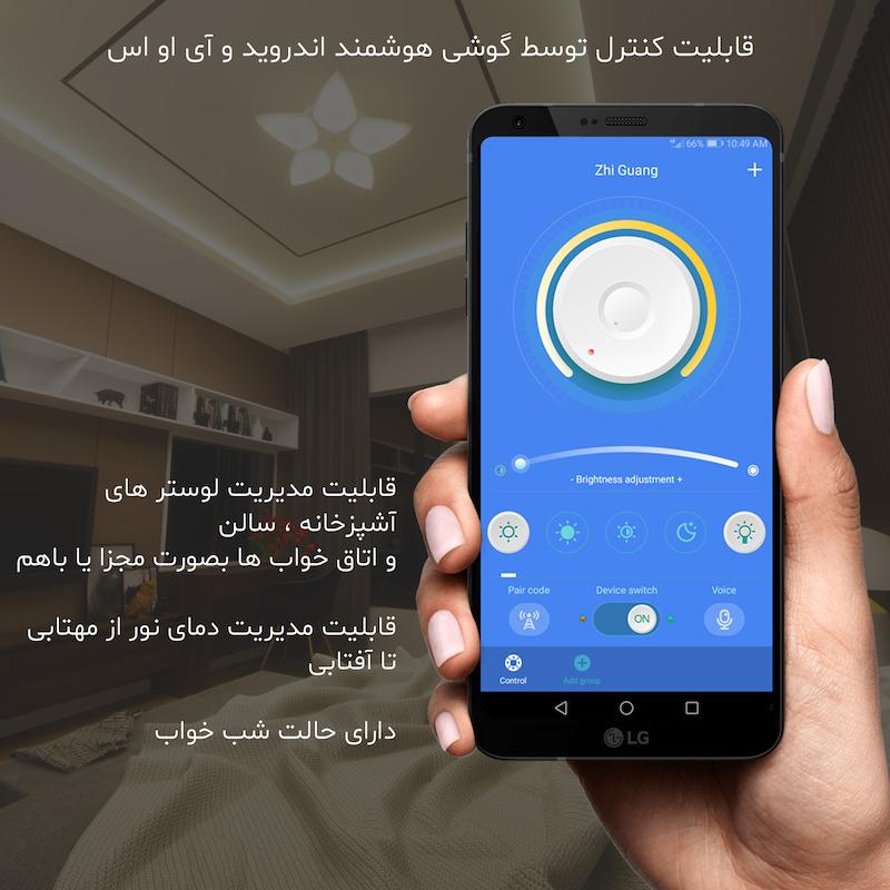 این مدل لوستر مجهز به قابلیتهای پیشرفتهای برای کنترل نور است: تغییر رنگ نور، تنظیم شدت نور و تنظیم دمای نور که همگی به آسانی قابل تنظیم هستند. دمای نور لوستر سقفی مدرن 5 شعله مدل ستاره در طیف رنگی بین 3500 تا 6500 کلوین (از مهتابی تا آفتابی) قابل تنظیم بوده و حالتهای شدت نور مختلفی، از جمله حالت شبخوابی (با نور بسیار نرم و مصرف انرژی کم) را ارائه میدهد. تمامی این تنظیمات توسط ریموت کنترل، کلید برق و گوشی هوشمند (با داشتن ریموت) امکانپذیر است.