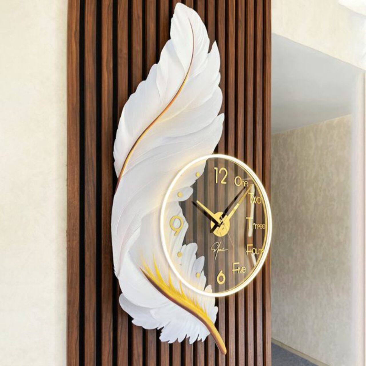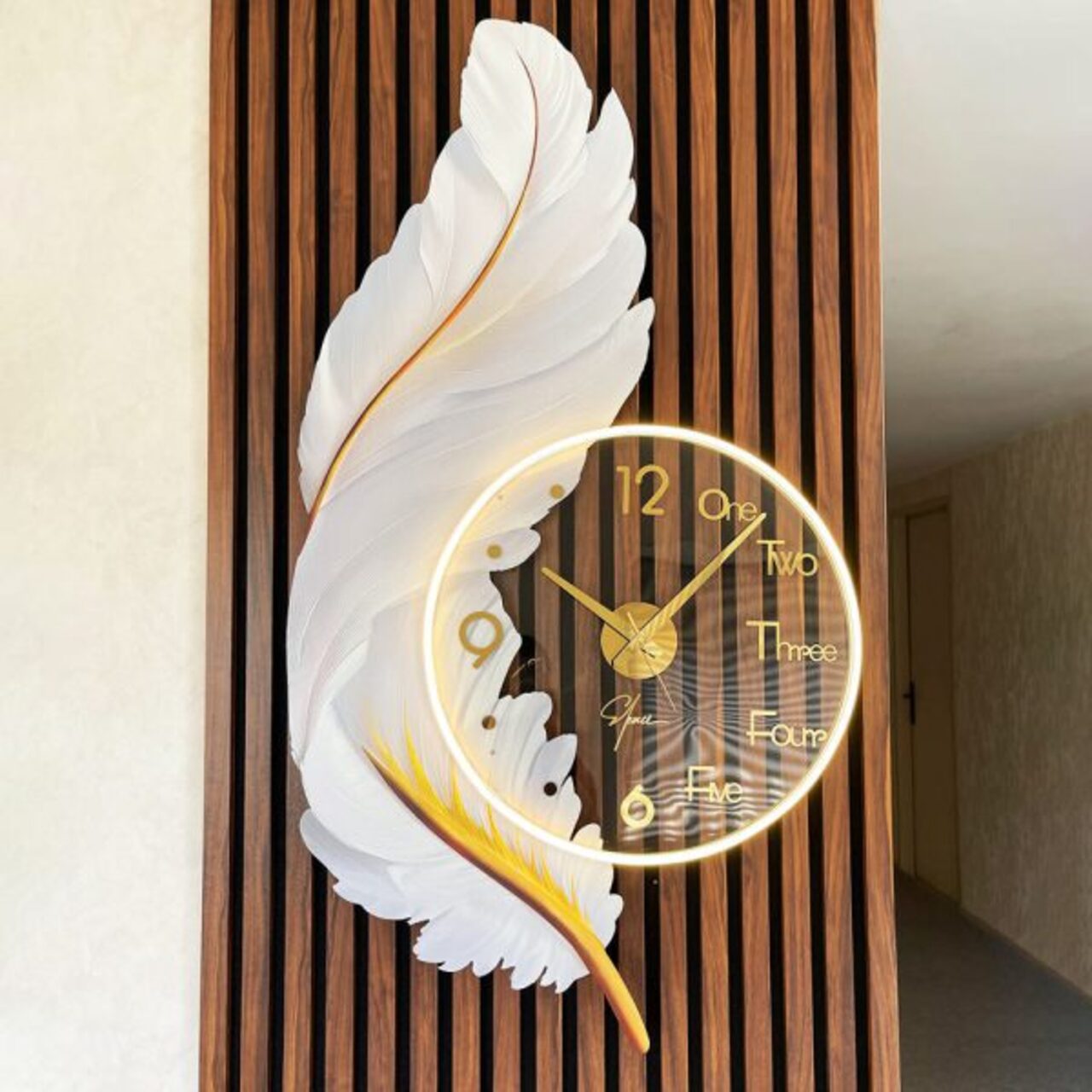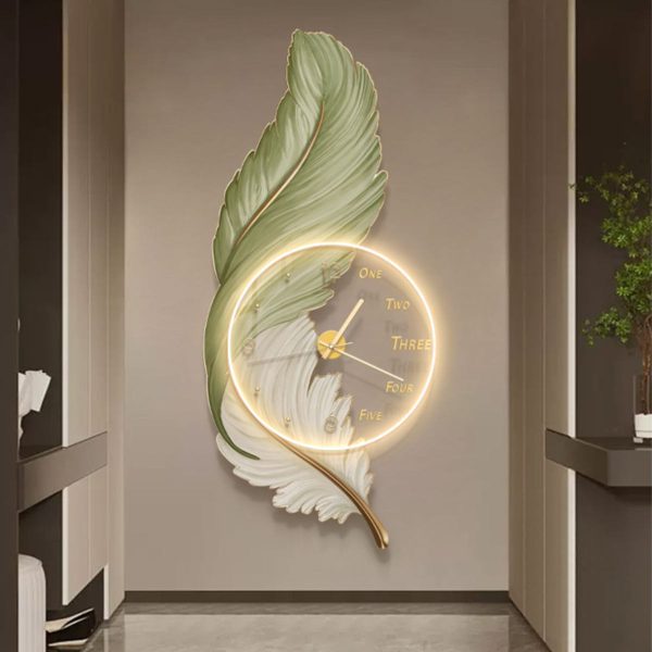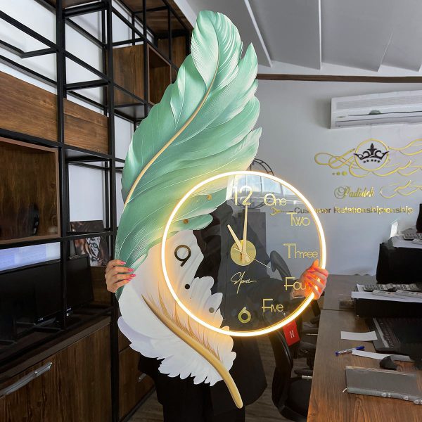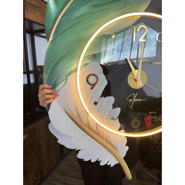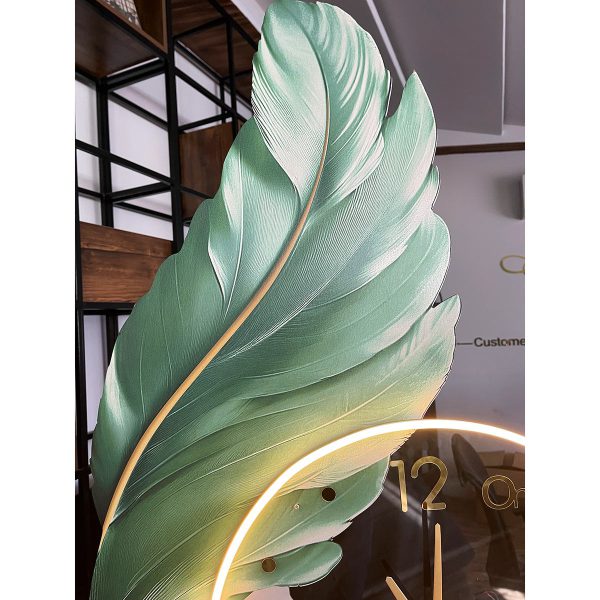 این ساعت دیواری لوکس با طراحی خاص برگ و پر، انتخابی ایدهآل برای افرادی است که به دکوراسیون مدرن و متفاوت علاقهمند هستند. ترکیب ظرافت برگهای سبز و سفید همراه با قاب طلایی و نورپردازی LED، جلوهای چشمگیر و هنری به فضای شما میبخشد.