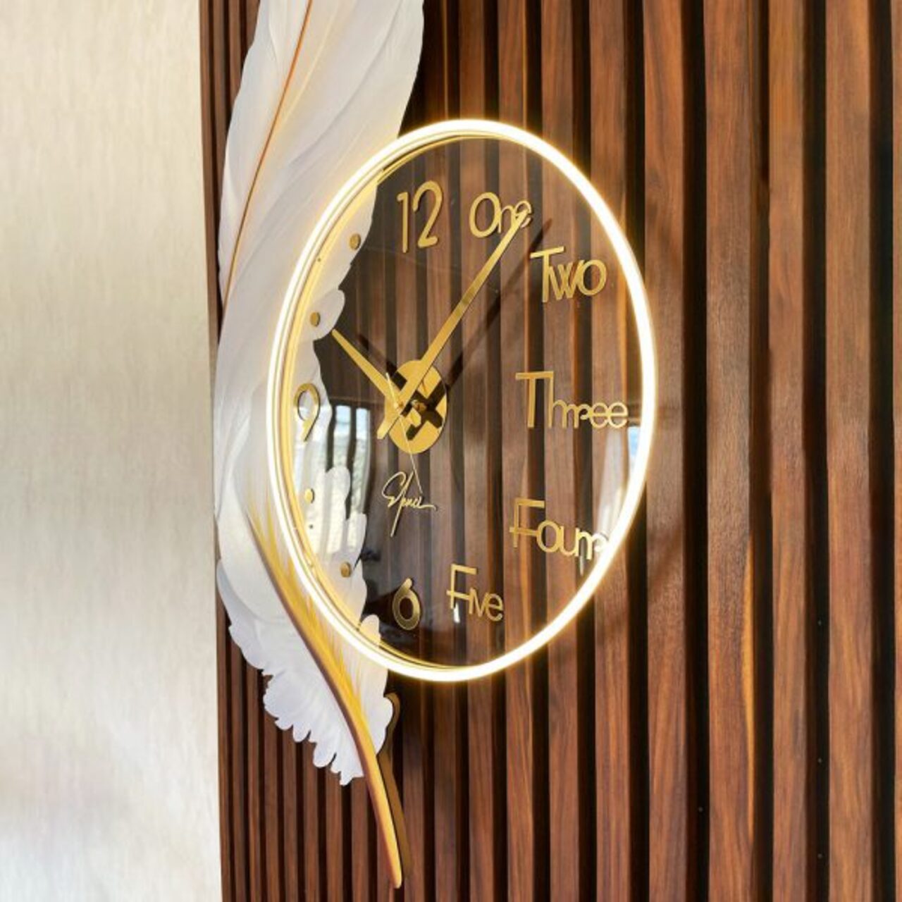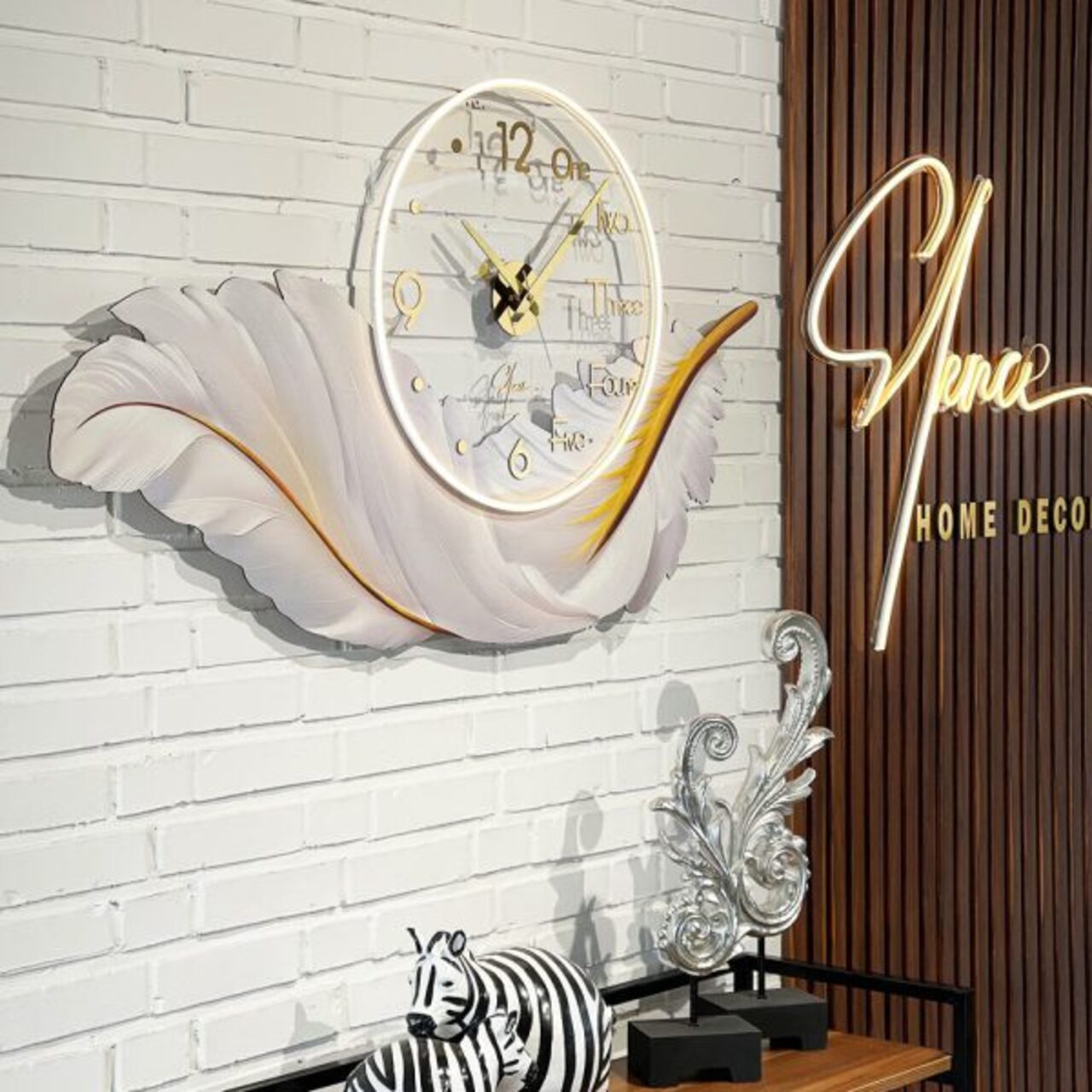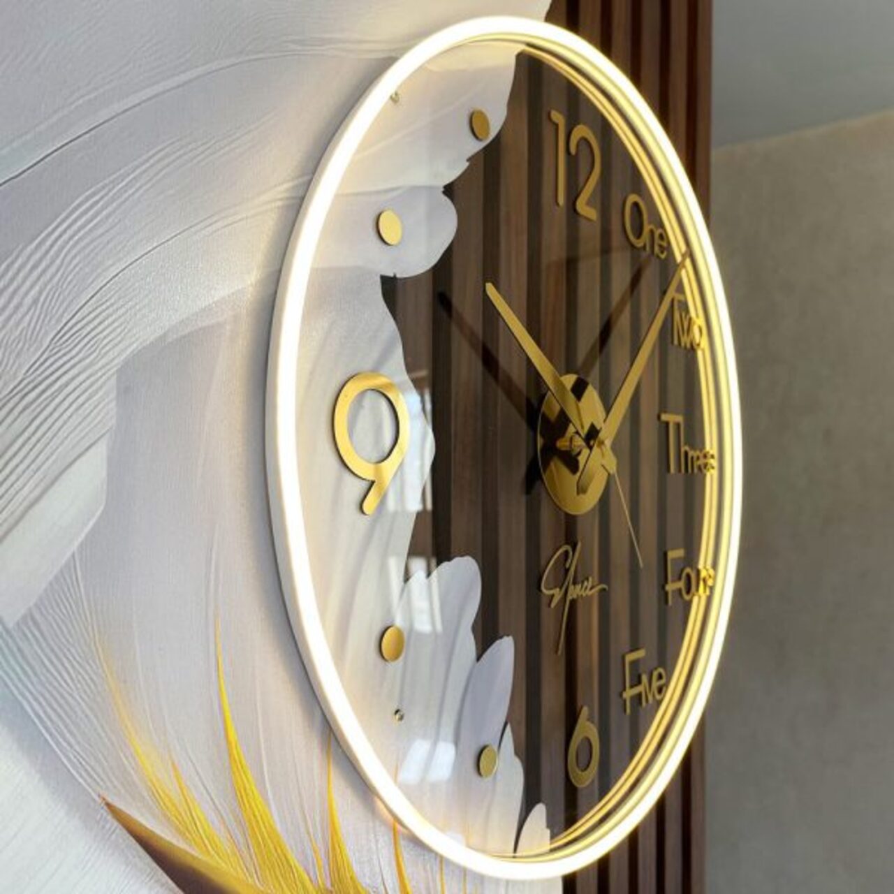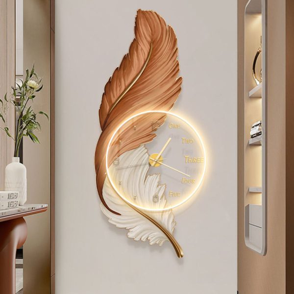 این ساعت دیواری لوکس با طراحی خاص برگ و پر، انتخابی ایدهآل برای افرادی است که به دکوراسیون مدرن و متفاوت علاقهمند هستند. ترکیب ظرافت برگهای سبز و سفید همراه با قاب طلایی و نورپردازی LED، جلوهای چشمگیر و هنری به فضای شما میبخشد.